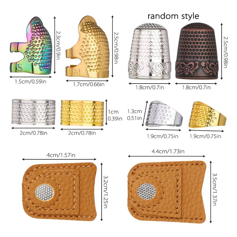 Package Included:2pcs sewing thimbles finger protector(golden + Dazzle Color)2PCS Generic Thickened Sewing Thimbles (golden + silver)2pcs ring sewing thimbles(golden + silver) 2pcs Leather finger protectors(Large +small)2pcs sewing thimble cap(silver+copper)Features:1.Made of copper, strong and durable, not easy to rust, long-lasting. 2.The size of finger sleeve can be adjusted. Designed for comfort to prevent your fingers from sweating. 3.Very useful sewing tool to protect fingers while sewing. Suitable for needlework, sewing, embroidery and other uses. 4.This finger protectors set is available in a variety of sizes.