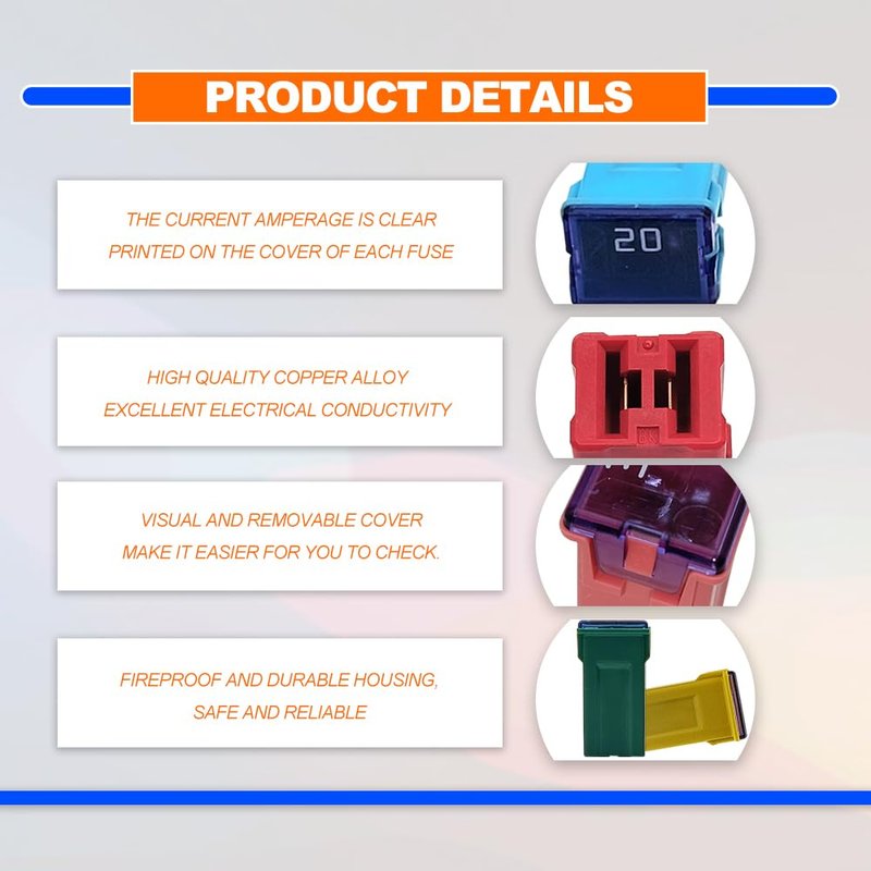 - 5 Different Colors of Fuses: The rating of each fuse is 2pcs blue 20A, 2pcs pink 30A, 2pcs green 40A, 2pcs red 50A, 2pcs yellow 60A. The carved amp rating figures on the top.