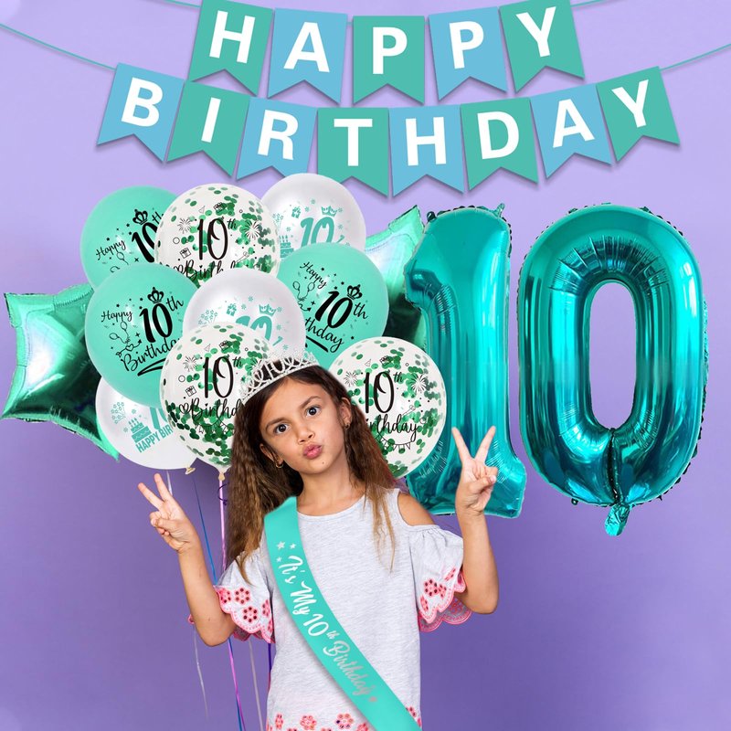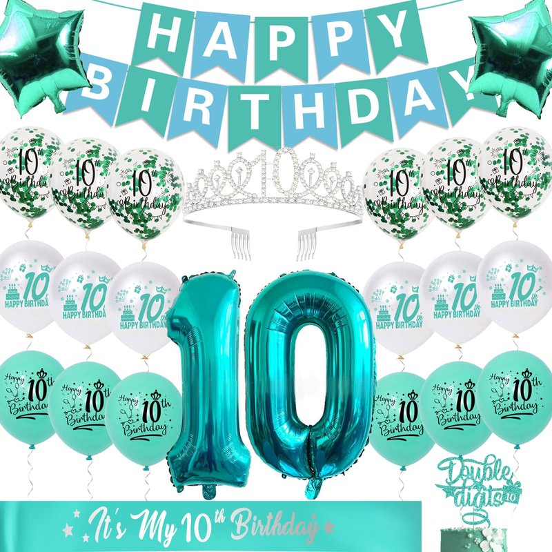 - 10thBirthday Decorations for Girls: The box includes: 18*12 inch 10th happy birthday latex balloons; 2*18 inch star foil balloons; 1*32 inch teal number "10" foil balloon; 1 teal “HAPPY BIRTHDAY”banner; 1 teal glitter cake topper; 1 silver birthday rhinestone crown;1 teal birthday sash with silver letter It’s my 10th Birthday
