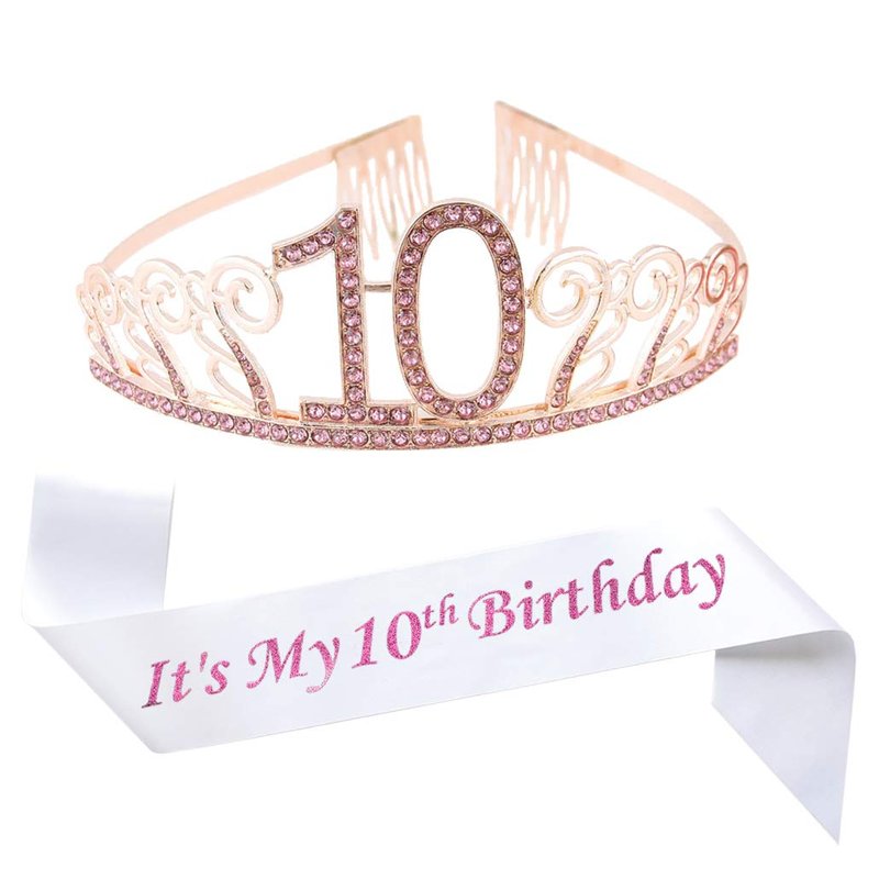 - THE 10TH BIRTHDAY KIT INCLUDES - 10th Pink rhinestone crown and glitter " It's My 10th Birthday " birthday sash. It is a wonderful set for girl's 10th party and the crown can still be worn for long after the cake is eaten.