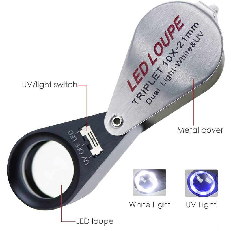 - PERFECT LIGHTING: The combination of UV light and LED lights makes this magnifier the perfect tool for viewing diamonds and other gemstones. The lighting options can be adjusted to suit different stones and environments
