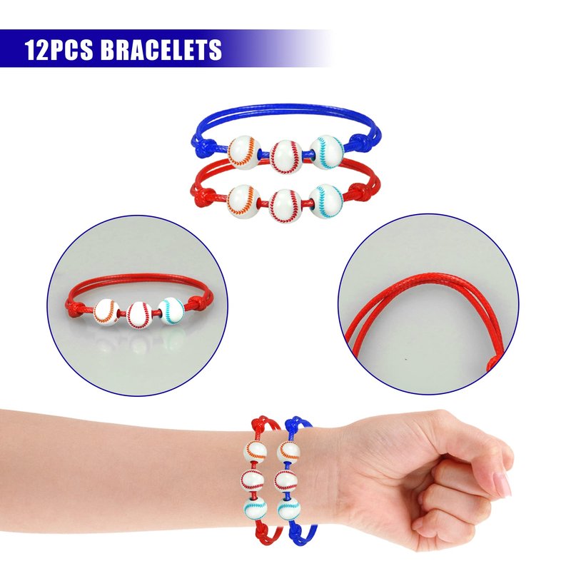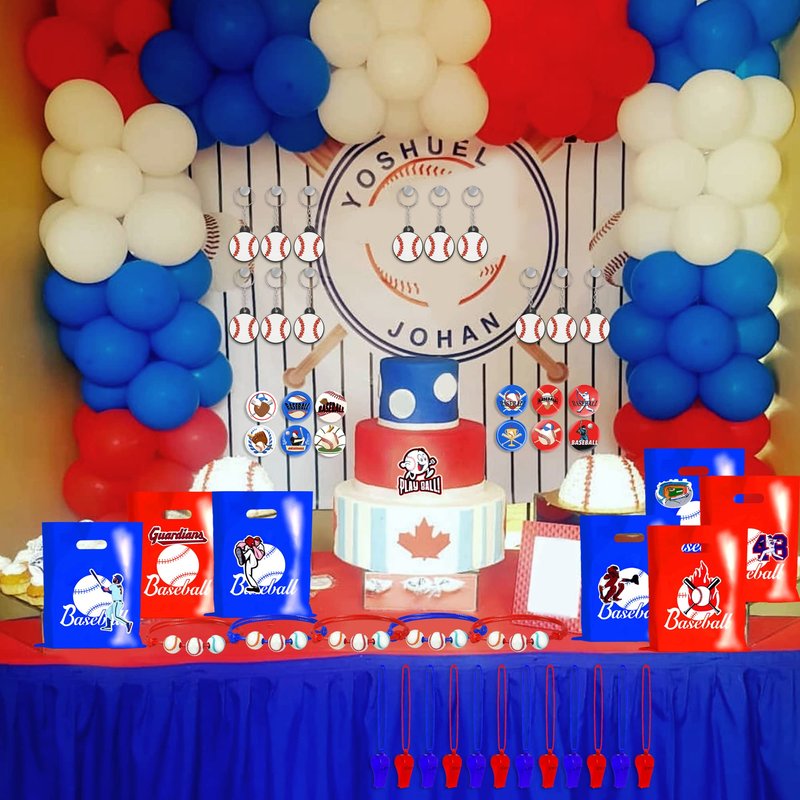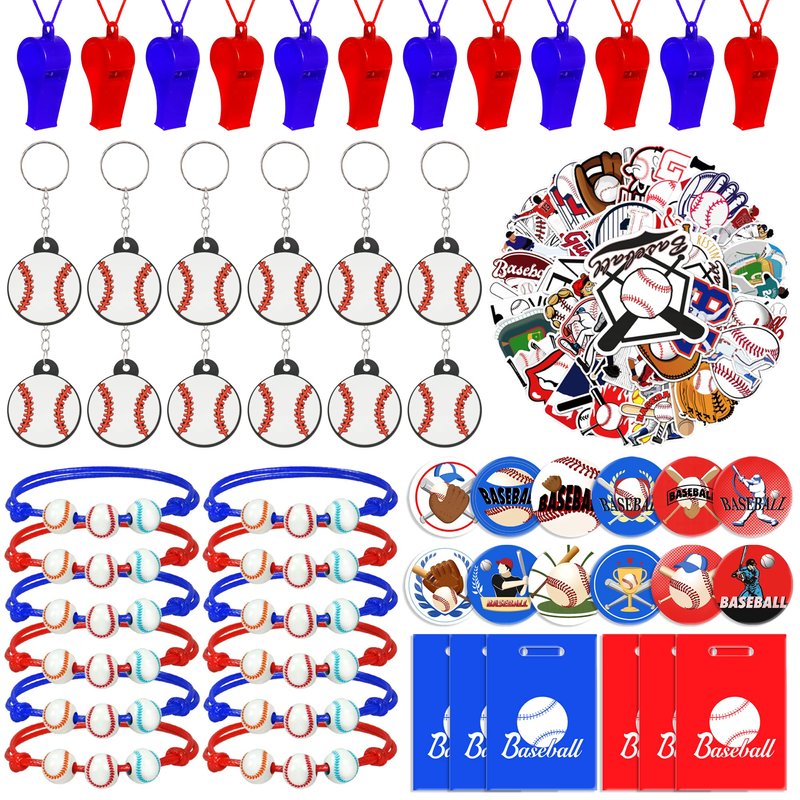 - Quantity:You will receive 12pcs baseball keychains; 6pcs blue whistles; 6pcs red whistles; 6pcs blue baseball bracelets; 6 red baseball bracelets; 6 blue baseball goodie bags; 6 red baseball goodie bags; 12 baseball button badges; 50pcs baseball stickers.(110pcs in total). Children and adults will love these baseball party favor supplies!