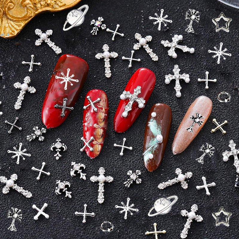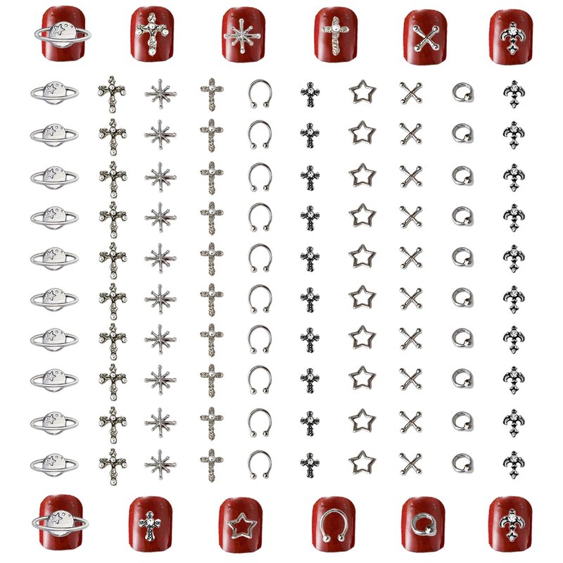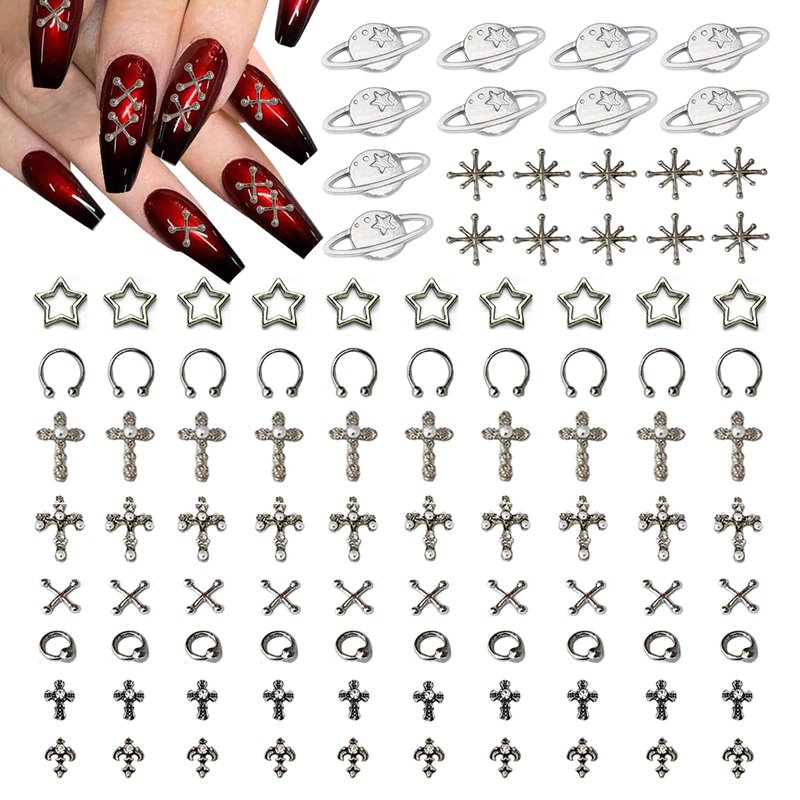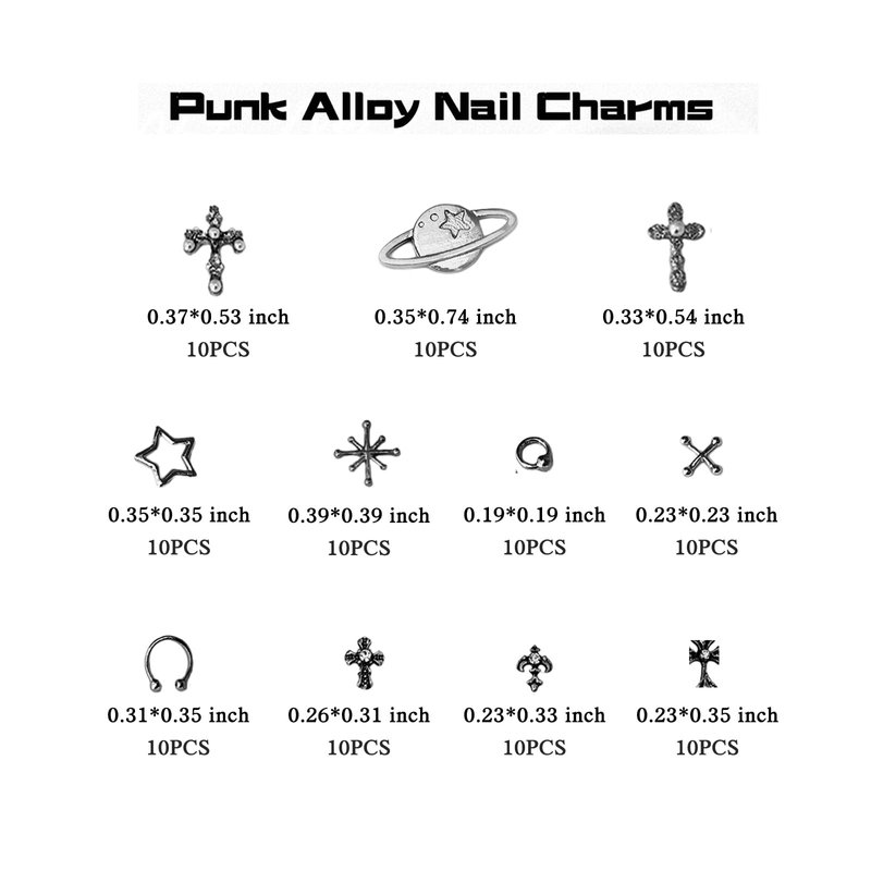 3D Nail Charms Specifications: Color: Sliver Styles:11 styles including stars, planets, crosses, punks, etc. Quantity: 110pcs Shape: stars, planet, cross, punk, etc. Material: Alloy Charming Decor The metal nail charms are also an ideal gift for friends, family and lovers; You can directly give them manicures on important days such as anniversaries, celebrations, Valentine's Day, weddings, engagements and Christmas, or you can DIY a handicraft to show them your love and care. Suitable for natural or artificial nails, just clean the surface of your nails, put them on your nails with glue, then apply a layer of top coat for nails and cure, which is very simple and suitable for professionals and beginners alike. How to use 1.Clean the surface of your nails and brush base polish. 2.Put the nail glue or nail gel on the nail. 3.Put the nail art rhinestones on the nails, cell phone's case, glasses, etc. 4.The UV lamp requires about 2-3 minutes. (If you use nail gel). 5.Brush the gel around the edge of the stimuli and 2-3 minutes in the lamp. 6.Clean the excess gel on the nails. Wide Application The silver 3D nail rhinestones charms are great for both professional nail specialists and nail art learners, you can be used by yourself or as a gift to friends. Beautiful,generous and glitter, it can also be used in crafts, shoes, clothes, cups, mobile phone cases, etc.