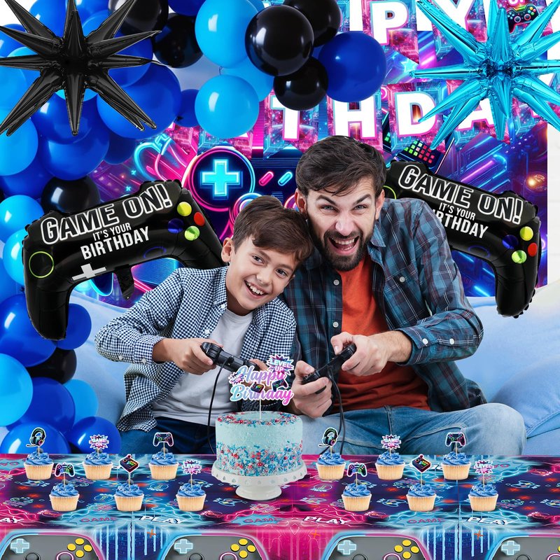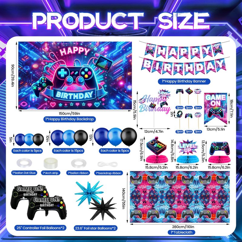 - Comprehensive Party Kit: This 112-piece set covers all your gaming party needs! It includes 1 large gaming backdrop, 1 "Happy Birthday" banner, a complete blue balloon arch kit with assorted size balloons, a thematic tablecloth to set the stage, an array of cake toppers to bring your dessert to life, and 3 pcs striking centerpiece to tie it all together. This kit is your one-stop solution for creating a memorable gamer's paradise.