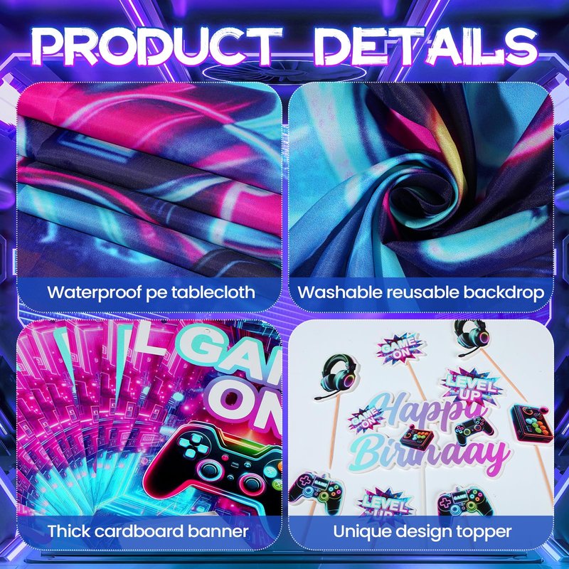 - Premium Quality Materials: Crafted from high-quality materials, this set is engineered to last throughout your gaming extravaganza and beyond. The sturdy backdrop, the balloons are made from robust latex to prevent easy popping, and the tablecloth is keeping your setup looking pristine. The cake toppers and centerpiece boast vivid colors and a professional finish, ensuring they stand out.