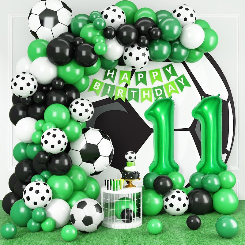 - 11TH BIRTHDAY SOCCER DECORATIONS:You will receive dark green balloons(25pcs),black balloons(25pcs),light green balloons(15pcs),white balloons(5pcs),latex soccer (8pcs),long white balloons(2pcs),18inch aluminum foil soccer balloons(2pcs),32inch number11 foil balloon(1pcs),green happy birthday banner(1pcs),a ribbon, balloon chain stickers,great for soccer 11th birthday party decorations