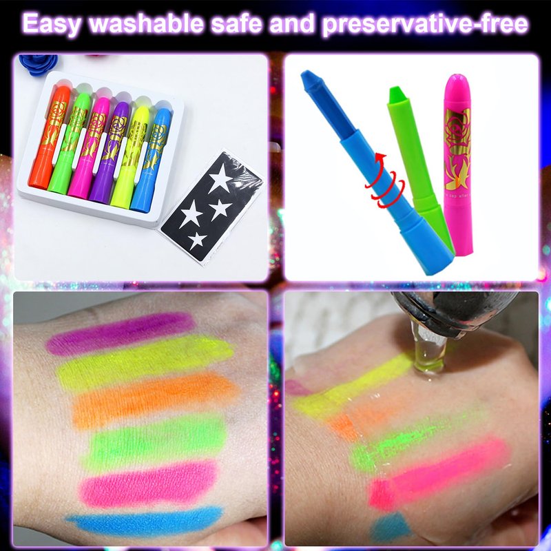 - [Convenient to apply and easy to clean]: The glow-in-the-dark crayon is designed with a rotatable design, which can be easily rotated to the right length for you to apply on the face and the right part of the body; easy to clean, wipe it with ordinary makeup remover wipes or use water to clean it up.