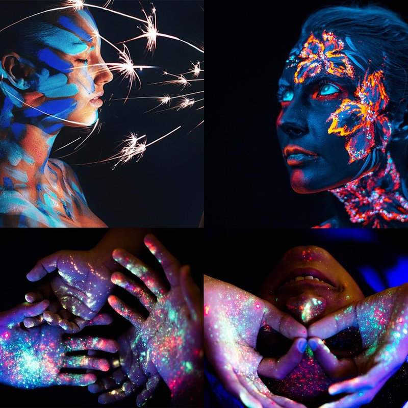 Material: made of food-grade pigments and PP shells; Usage: Apply to face and body parts; Scenario: party, holiday party, birthday party, Halloween and other festivals; Effect: glowing under UV light and black light.