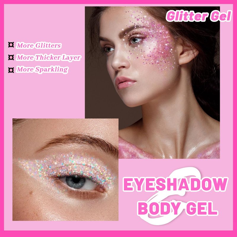 - 【Safe and Gentle】The body glitter gel is made of non toxic material and gentle material, not irritate on the skin.It can be used on the eyes,face,eyebrows, lips, cheeks, face, nails, hair,collarbone,face glitter for kids or any part of your body, you can use it with complete confidence