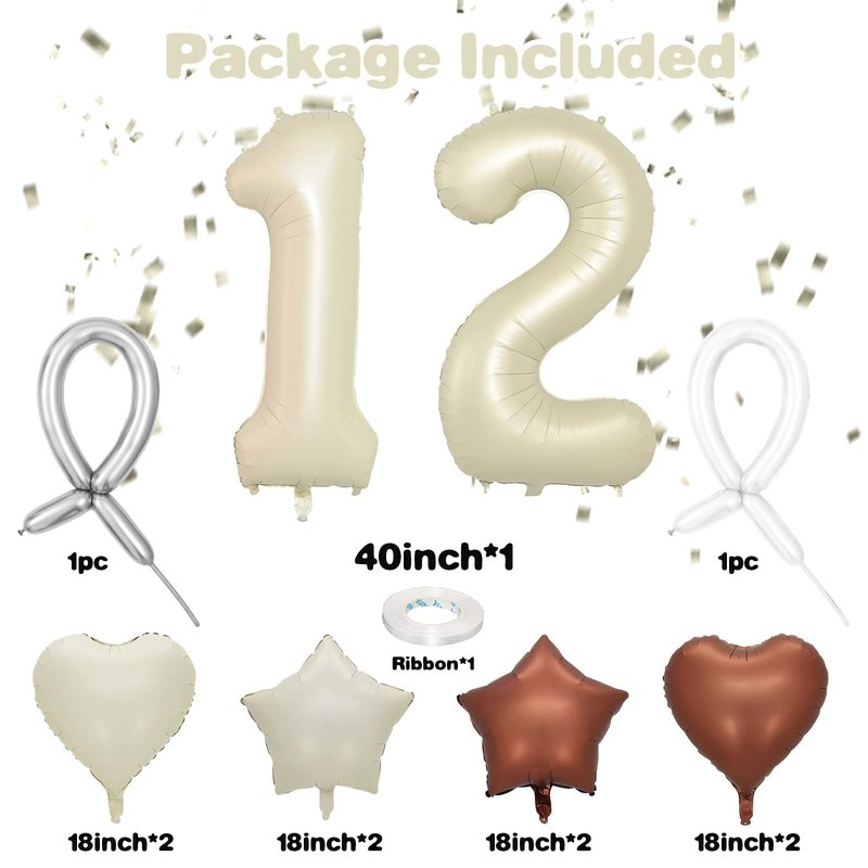 - Cream Number 12 Balloons Set: Our set includes 2 x 40 inch cream white number aluminum film balloons, 2 x beige star balloons, 2 x brown star balloons, 2 x beige heart balloons, 2 x brown heart balloons, 1 x metallic silver long balloon, 1 x white long balloon and 1 x white ribbon.These nude foil globos number balloons add a pop of fun to any celebration, suitable for birthdays, anniversaries.