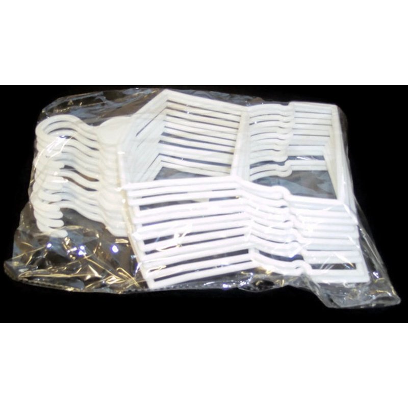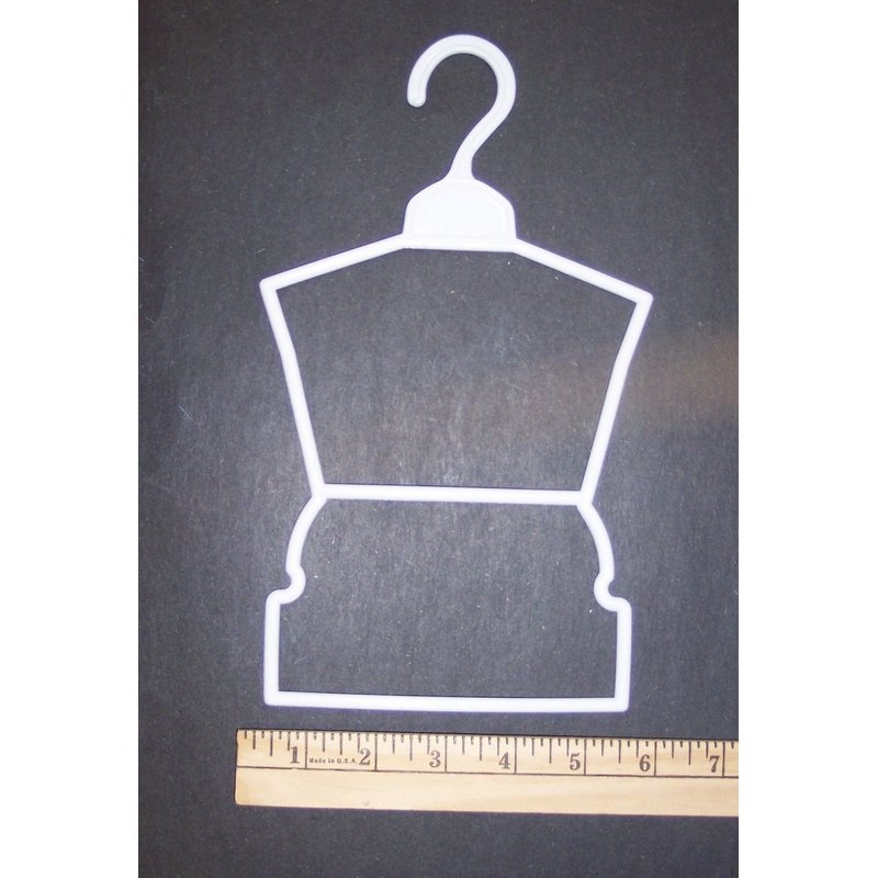 12 White Plastic Outfit Hangers - 1 Dozen Listing is for: 12 white plastic outfit hangers Features: 6" wide 10" long Opening that goes over the rod is 1" wide Will also fit: 15” Doll Clothes Please Note: The items I sell are new manufactured items made to fit 18” Doll Clothes.