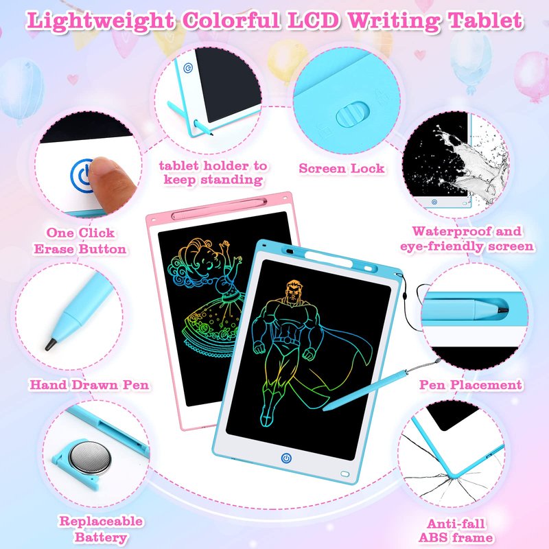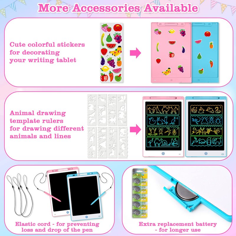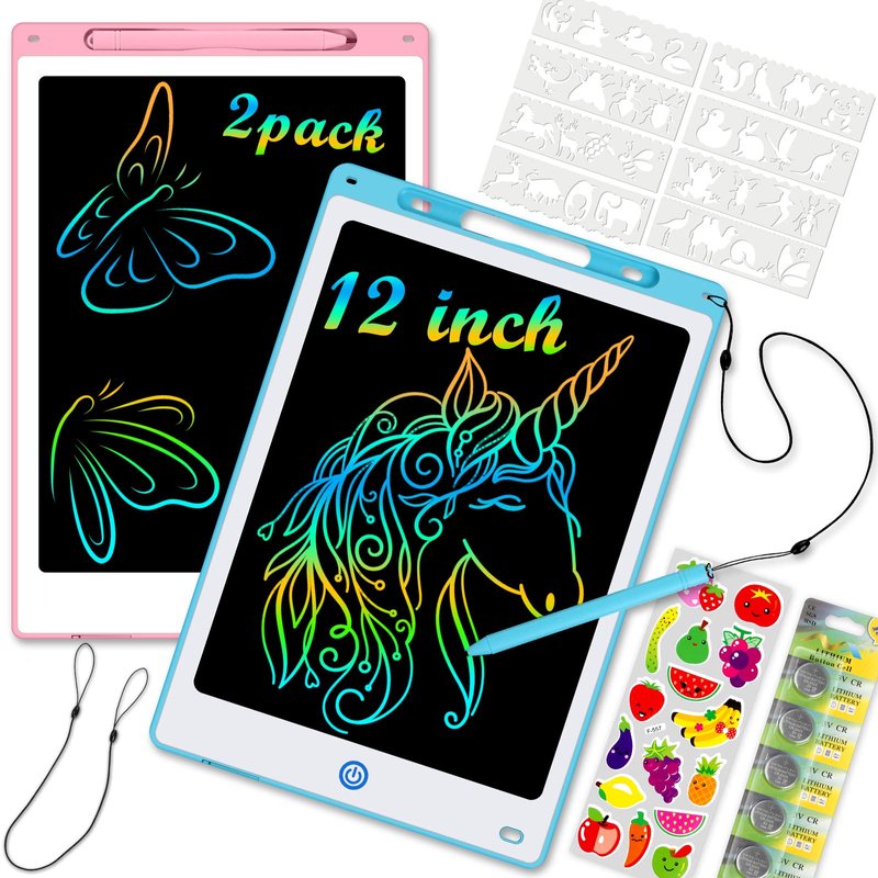 - 🎀【Double Doodle Board & Accessories】1 blue and 1 pink 12 inch kids drawing pad is perfect for boys/girls aged 3-12, one for home and one for school. You can decorate your tablet with the included stickers, and there are 8 traceable stencils you can use to trace its different shapes and animals to help with creativity. Comes with extra batteries for long-term use. TIPS: If the coloring tablet you received is damaged or the accessories are missing, you can contact us for free replacement.