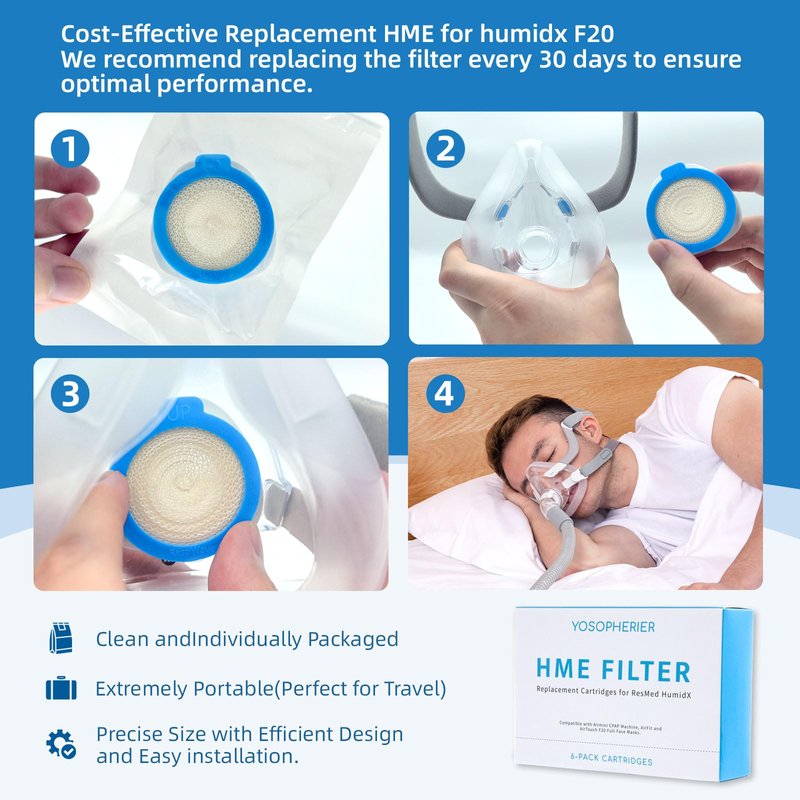 - Compatibility: Our filters are compatible with AirMini CPAP machines using AirFit F20 masks and AirTouch F20 masks. Our products have precise size compatibility, and their compact and efficient design can be easily inserted from the inside of the mask and connected to the mask frame, providing effective and comfortable humidification. This not only improves the efficiency of the CPAP machine, but also ensures optimal sleep therapy.