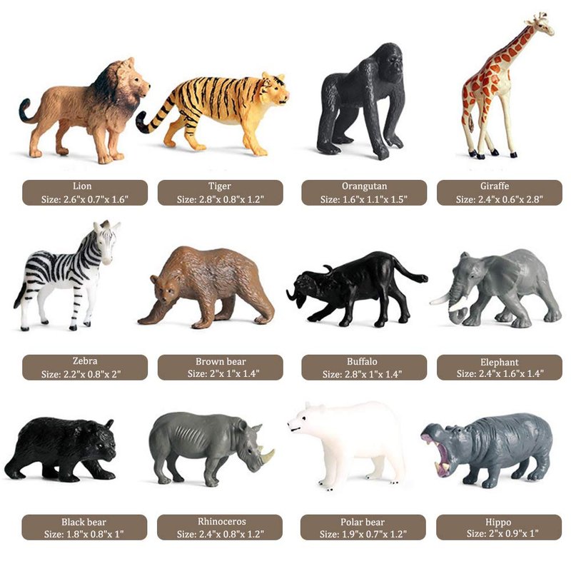 - 12 Small Safari Animals: Tiger, Lion, Giraffe, Orangutan, Zebra, Brown Bear, Buffalo, Elephant, Rhinoceros, Hippo, Polar Bear, Black Bear. The size about 1.2 to 2.4 inches in length, Please refer to the picture size comparison photo.