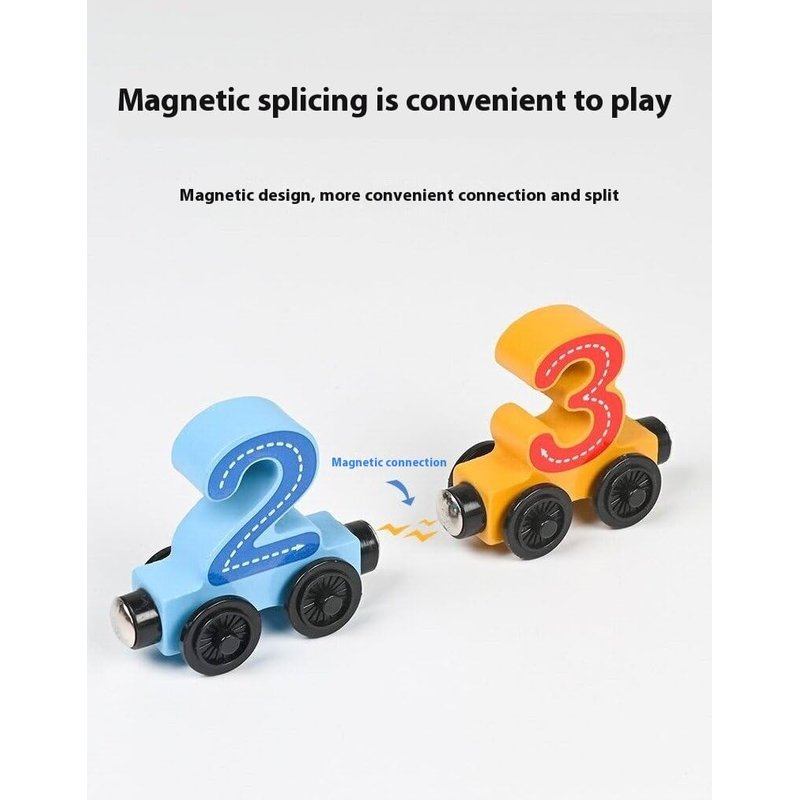 12 PCS Number Train: Wooden train set with bright color consists of 11 pcs number,and 1 pcs train head, every train body is individual and connected by magnets. Each train has 4 sliding wheels which glide easily.