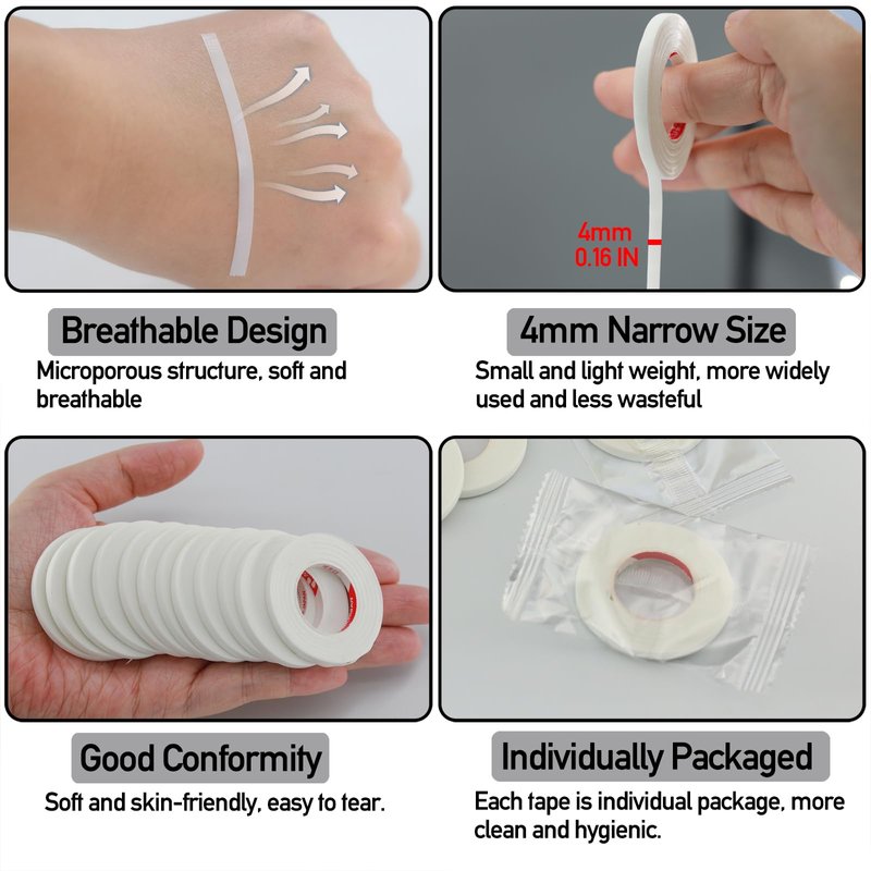 - Ultra-Narrow Size: The micropore tape only 4mm(0.15 inch) in width,can minimize contact with skin. You can tear eyelash extension tape into any length you need. Perfect for covering the lower lashes or to tape the eyelids during eyelash extension application.