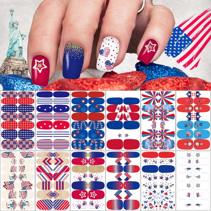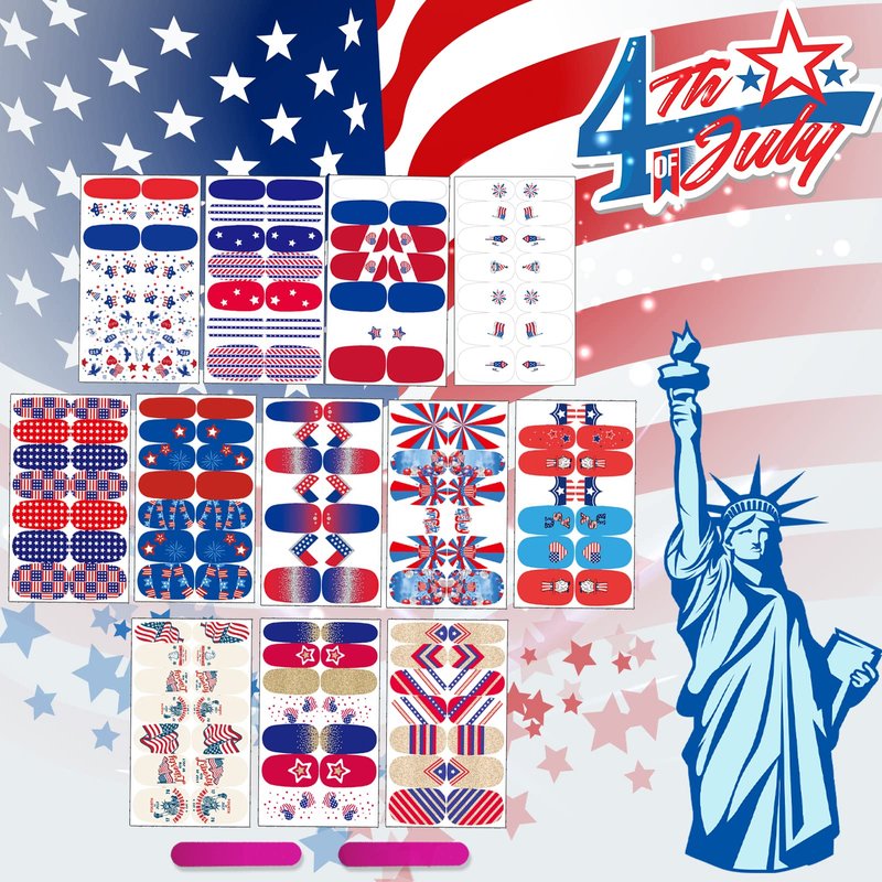 - Value Pack: You will get 12 sheets 4th of July USA full wraps nail art sticker and 2 piece nail files, rich colors and classic American flag patterns. which can offer you multiple choices, satisfy your rich imagination of nail DIY and create your own.