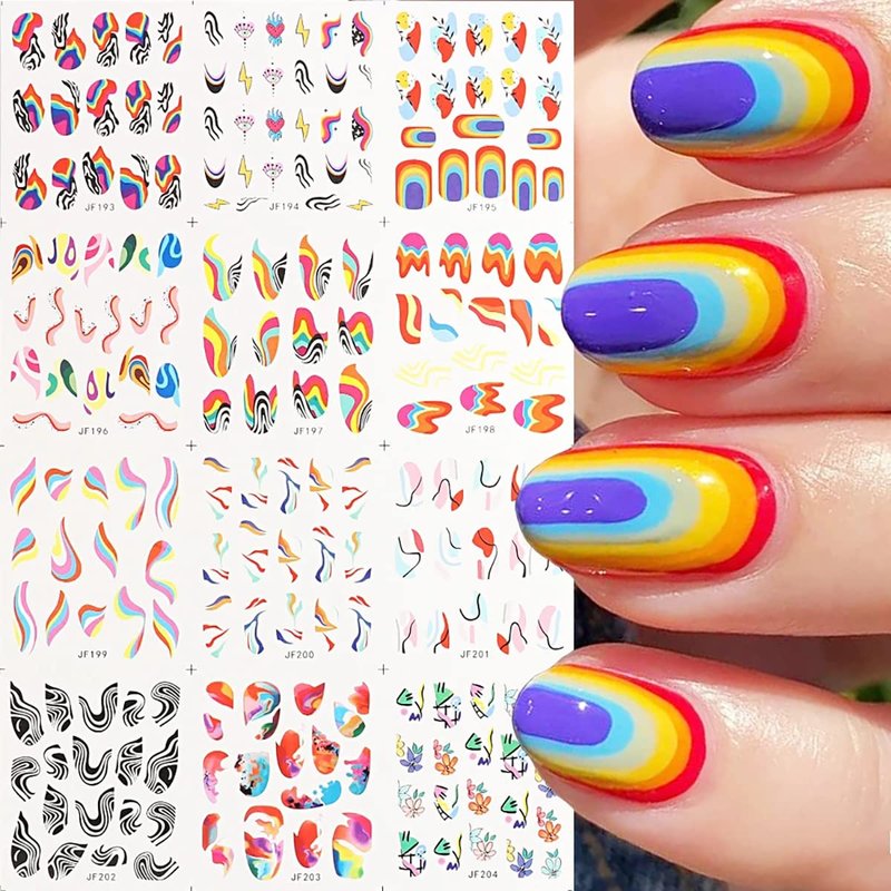 12 Sheets French Nail Art Stickers Decals Colorful Stripes Lines Irregular Geometric Water Transfer Nail Stickers 3D French Abstract Nail Decals Nail Art Supplies for Women Girls DIY Acrylic Nails