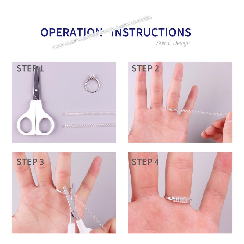 Choose the suitable ring and Wrap one end of the ring size adjuster on the ring band,gently twist the adjuster around the ring and put on the ring and make sure ring fits comfortably!