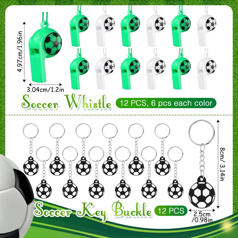 - Soccer Party Favors: there are a total of 120 pieces of soccer party supplies, including 10 sheets of soccer temporary tattoos, 50 adhesive soccer stickers, 12 small soccer toy, 12 soccer silicone bracelets, 12 soccer whistles, 12 soccer keychains and 12 double loop lanyards, different items with adequate quantity to satisfy your diverse and soccer party using, decorating and sharing needs