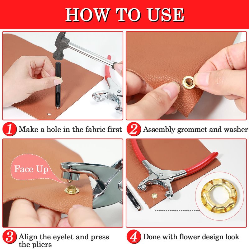 - 【Wide Application】Our eyelet repair grommet pliers set can be used on various materials such as fabric, leather, tarp, tent, canvas, plastic, etc. Great for hobbyists, leather craft DIY art that require punching