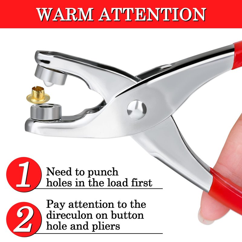- 【Easy to Use】First punch a buttonhole-sized hole in the material to be installed with the buttonhole, put a hole in the protruding end of the pliers, then place the material to be punched in the middle, and then simply align with the pliers here to press in eyelet, press the handle into the eyelet. Pay attention to the direction of the button hole and pliers and the strength of the hand, incorrect direction and force will cause damage to the button hole.