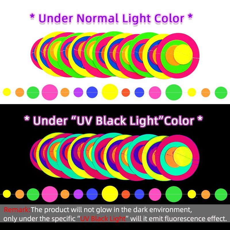 - 【GREAT VALUE 】Package Include: 120feet /6PCS Round Dot Neon Garland with 7 Neon Colors.These UV Glow Party Supplies and Decorations , which meet the needs of festivals or daily party decoration and are sure to be loved at any neon theme or luminous party.