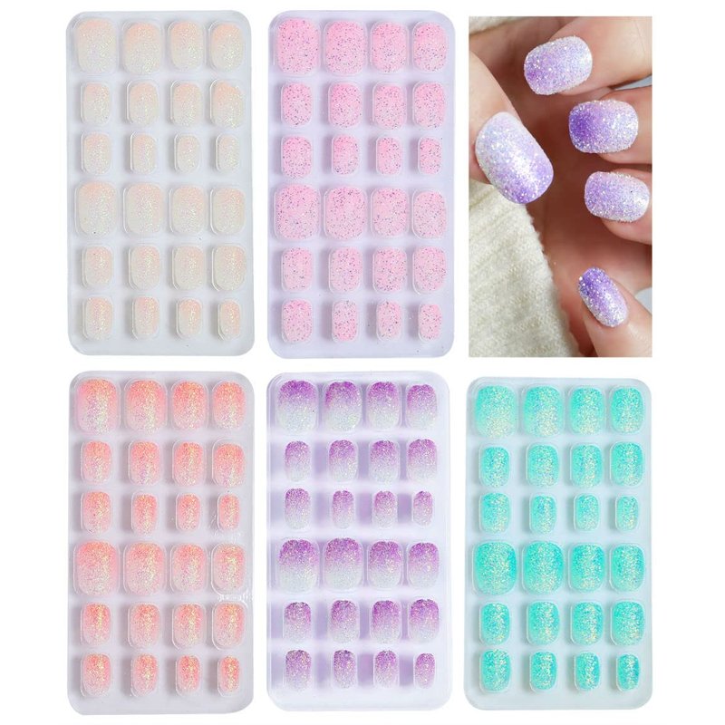 120pcs False Nails Press on Nails for Kids - Self-Adhesive Short Fake Artificial Full Cover Nail Art Kits Transation with Nail Glue Tabs for Girls Children (120pcs Sparkle Nails)