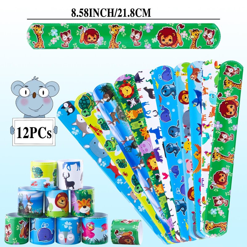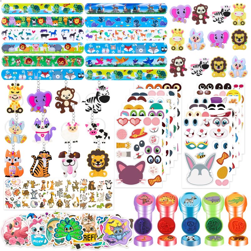 - Package Include: the jungle safari party favors set includes 12 PCS animal keychains, 12 PCS animal rings, 12 PCS safari slap bracelets, 12 PCS tattoos, 10 PCS safari stampers, 12 PCS face stickers, 50 PCS stickers, best for the party goodies bags.