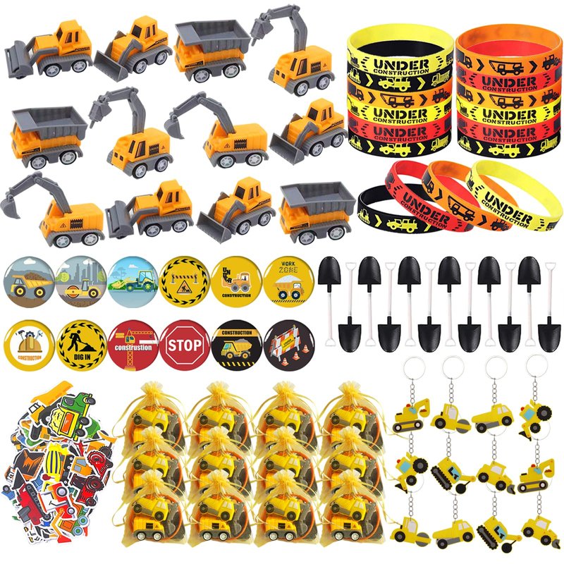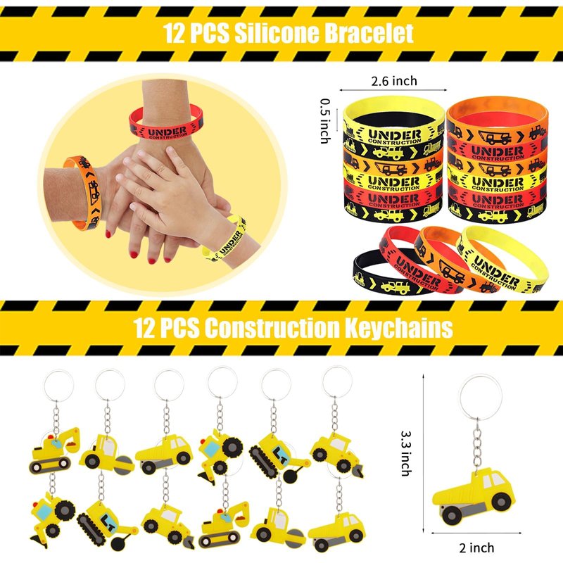 - PACKAGE - Construction birthday party supplies Include 12 construction vehicles, 12 organza bags, 12 silicone bracelets, 12 construction keychains, 50 vehicles stickers, 12 trucks button pins, 12 mini shovel toys, total 122 pieces construction party favors toys.