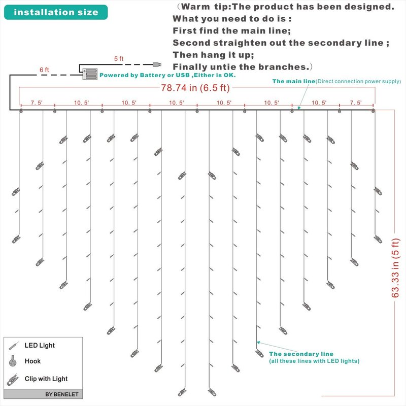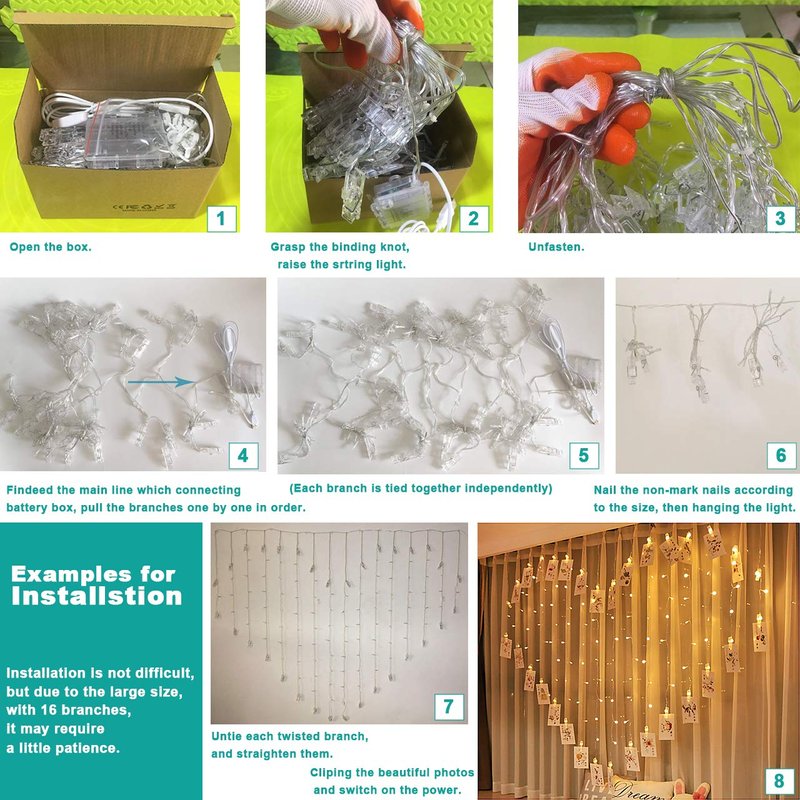 - ◈. Easy Hanging UP :The hanging size is 6.56x5.25 ft, so need to make sure the space where to hanging, like the wall or the window...is enough big.10 hooks come with,Fix the hooks follow the size of installation size, find the main line of the string, then hanging from one side to other side. >>NOTE: Don't cut the nylon cable ties of the main line. They are finalize the design of heart shape.
