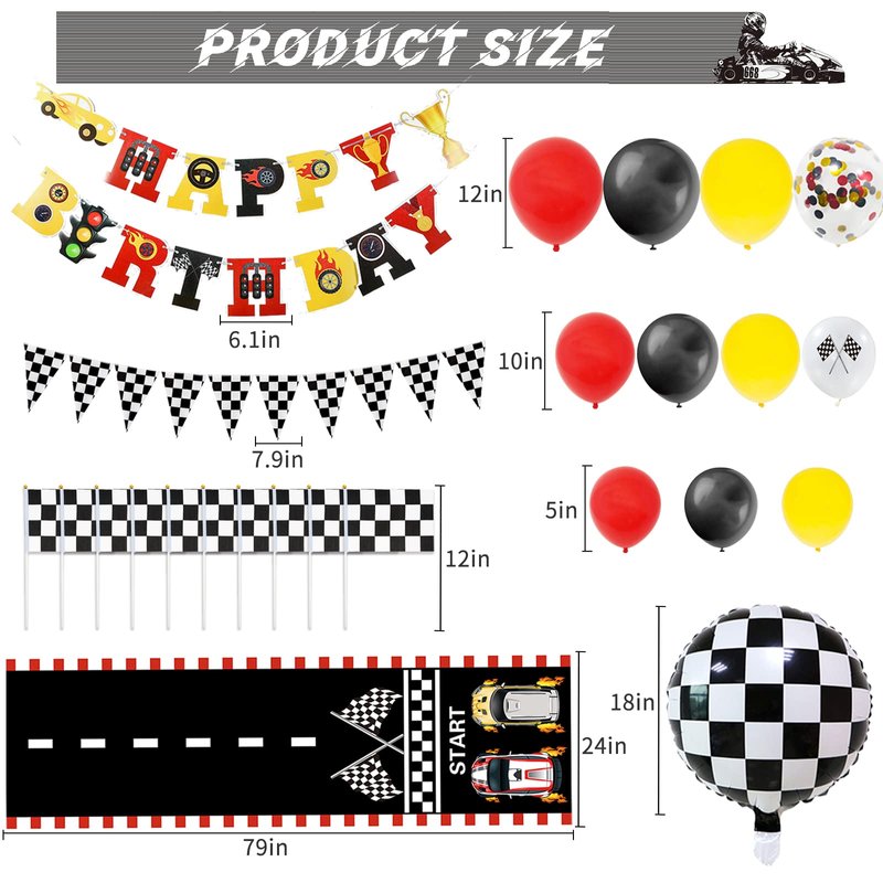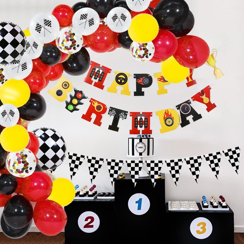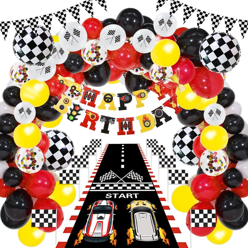 - Race Car Birthday Party Supplies Includes: Race car balloon garland kit composed of 90pcs latex balloons of different colors and sizes, 4pcs checkered aluminum foil balloons, 1pcs2*6.6ft race track, 10pcs checkered flags with poles, 1pcs checkered banner, and 1pcs happy birthday banner. Rich enough to meet all your needs and hold an impressive racing party!