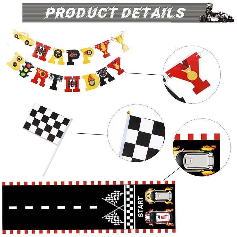 - Worry Free After sales: I'm sure you will like our carefully designed race car birthday party supplies with vibrant racing track and checkered flag, making the whole party full of vitality and a strong atmosphere. If you have any questions about race car decorations for party you received, please feel free to contact us and we will provide you with satisfactory service!
