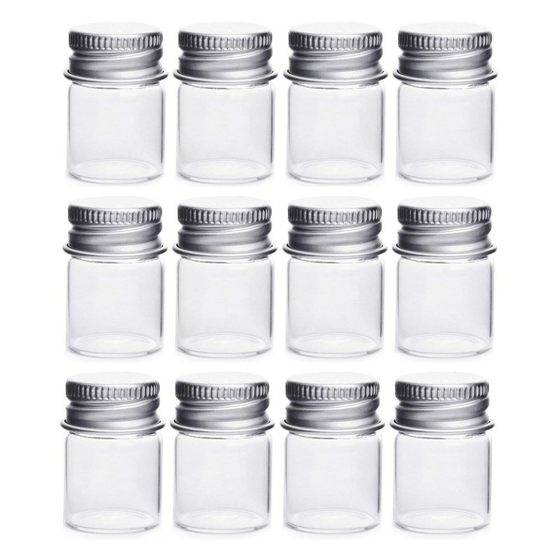 12PCS Empty Clear Travel Portable Glass Wish Bottles with Silver Aluminum Cap Essential Oil Powders Cream Ointments Grease Storage Container Jars Cosmetic Makeup Sample Packing Holder(5ml/0.17oz)