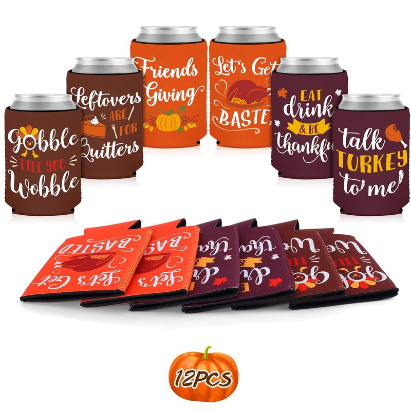12PCS Friendsgiving Party Decorations Can Cooler Thanksgiving Fall Party Favor Potluck Dinner Friends Gathering Neoprene Can Sleeve for Soda Beverage Thankful Feast Party Supplies