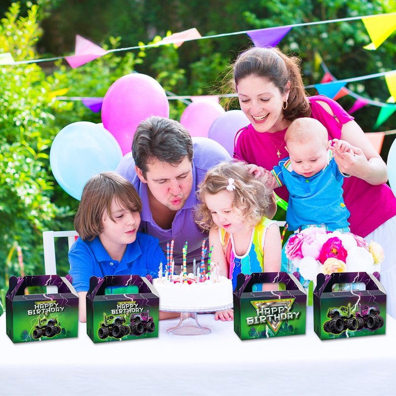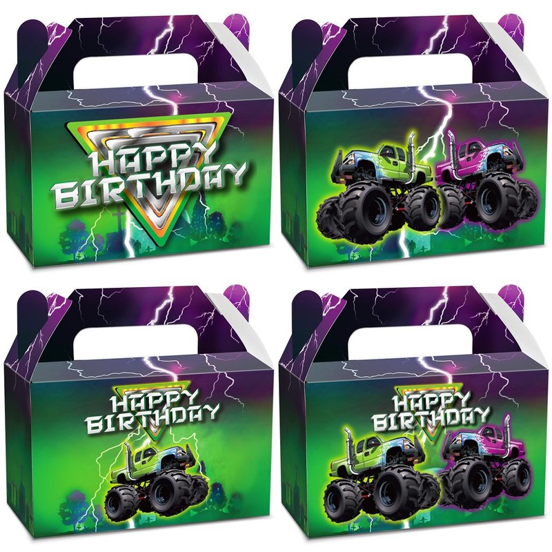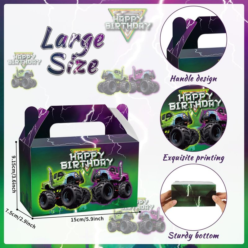 - Package includes: You will get 12pcs of green and purple monster truck boxes in 4 different designs(Front and back are the same design). The size is 6 x 3 x 3.6inches. These monster truck party treat boxes add an element of surprise and delight, enhancing the overall gifting experience, and creating anticipation and excitement when the recipient unveils the treat inside.