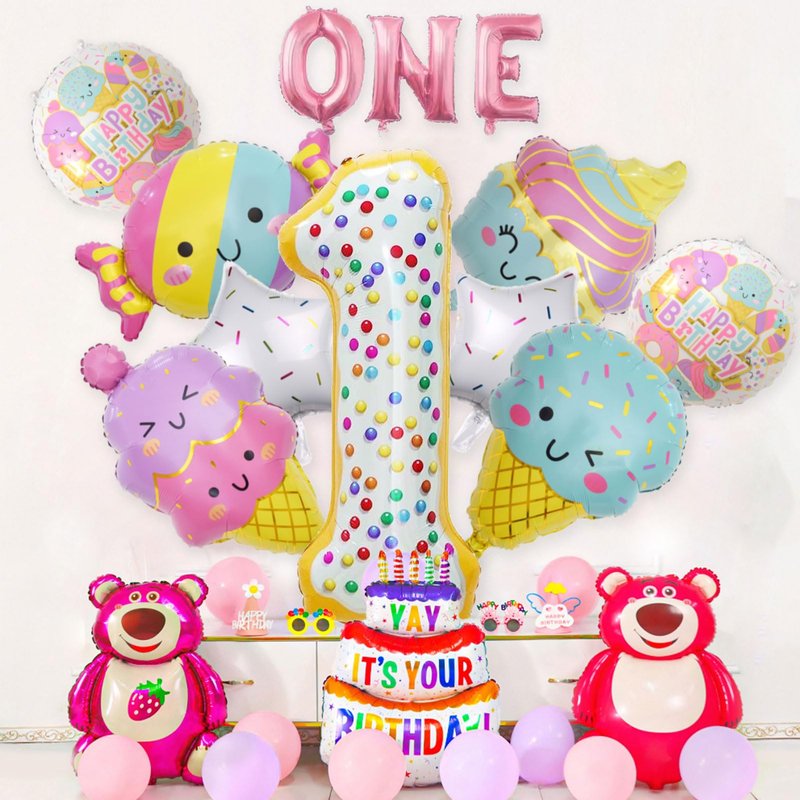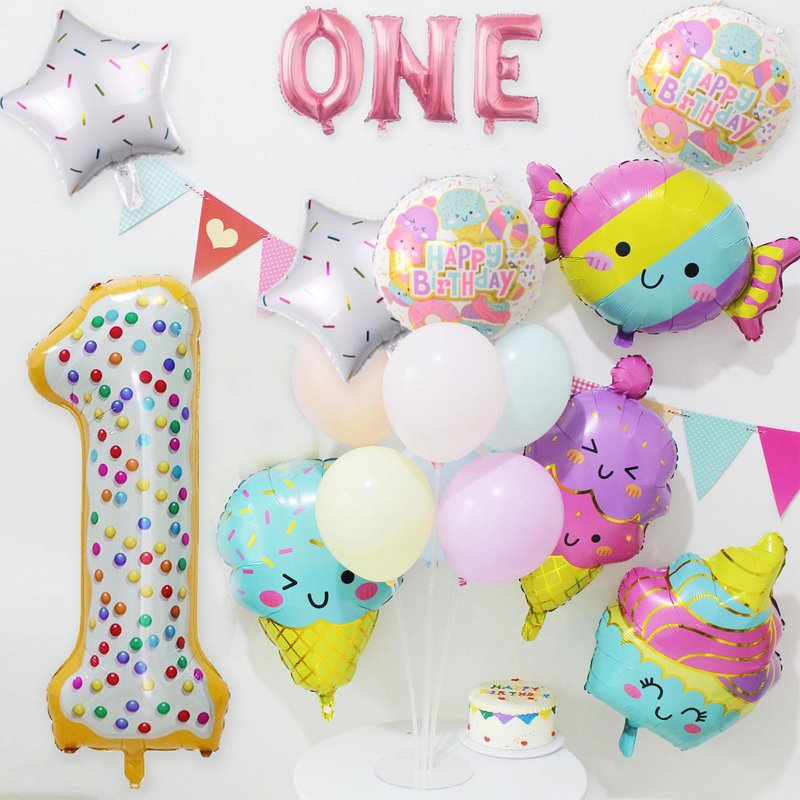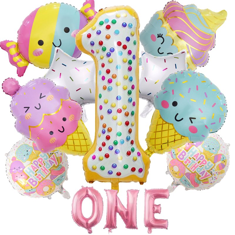 - GREAT PACK FOR 1ST BIRTHDAY DECORATIONS | CUTE Ice Cream: Package comes with 12pcs balloons : 1pcs 40” number 1 balloon, 3pcs 16" Letter balloons: ONE, 4pcs ice cream size about 31in, 2pcs 18” round candy Balloons, 2pcs 18 " white candy star balloons. Whether you're throwing a Ice Cream themed party decor at your little one’s birthday, these balloons set are sure to make a statement.