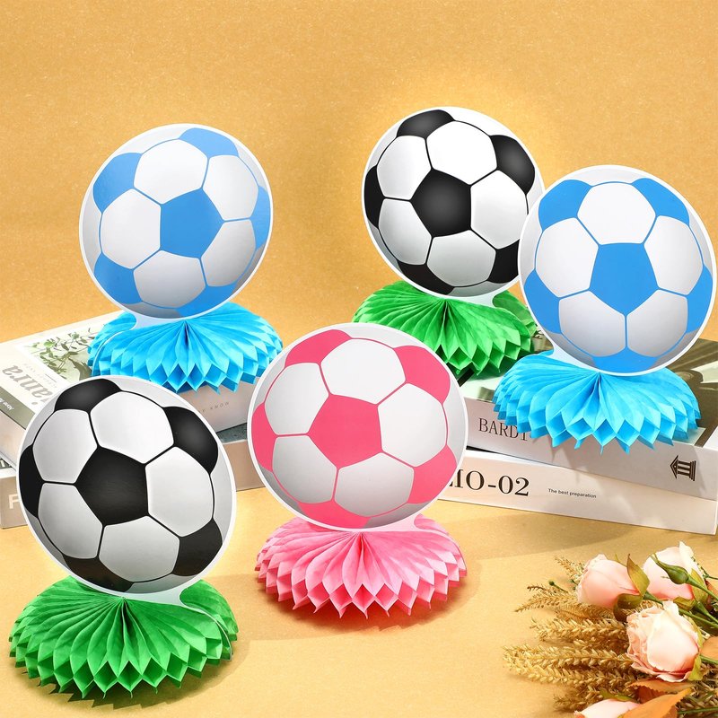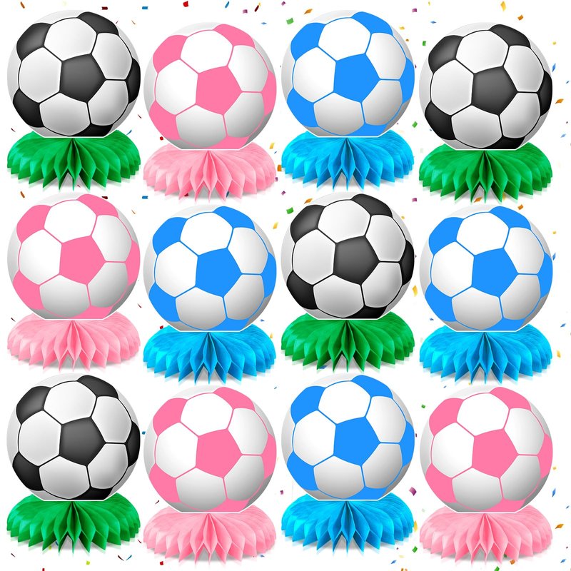 - ⚽【Soccer Theme Birthday Party Decorations Set】There are 12pcs soccer ball centerpieces (3 different colors). Funny and wide variety of soccer theme party decorations for all kids. All these soccer ball honeycomb centerpieces are printed with clear and cute patterns. It is a very clever package for a football and soccer party.