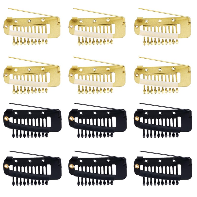 12pcs Wig Clip with Safety Pins, 10-Teeth Hair Extension Snap Invisible Wig Combs to Secure Wig No Sew Chunni Grip Dupatta Clips for Girls Women Wig Headscarf Hijab & Tikka (Black, Gold)