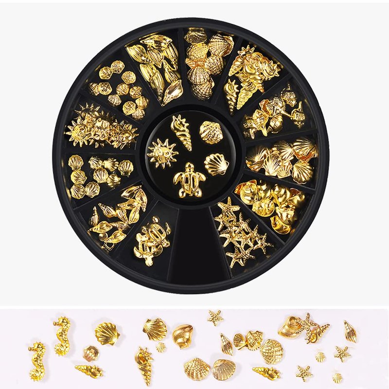 12Styles Nail Art Metal Studs Gold Metallic 3D Pieces Rivet Palm Tree Turtles Marine Life Charms for Summer Beach Ocean Manicure DIY Acrylic Nails Design Supply (Gold Ocean Studs)