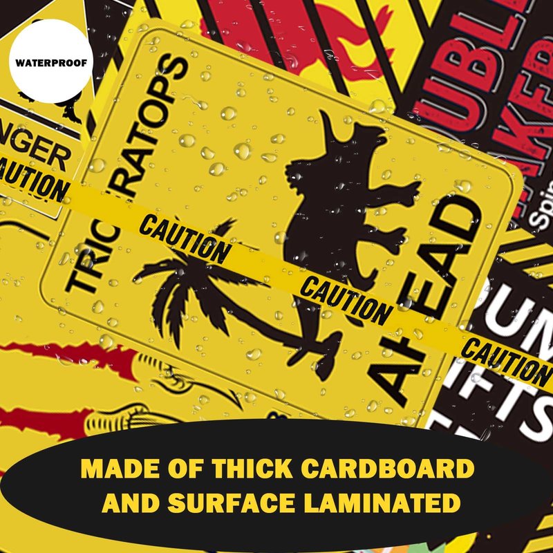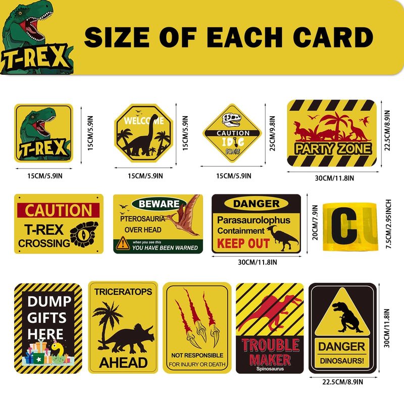 - Size : each dinosaur sign cardboard size is around 5.9 - 11.8 inch with different shapes for party decoration; Yellow Caution Tape is long enough to catch the attention of kids and guests