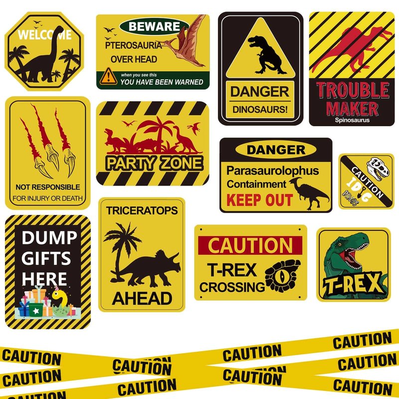 - Package includes : 12 pieces dinosaur birthday party signs with 1 strip of yellow warning tape, enough glue points, each cardboard features a message, including dino skull, party zone, Tyrannosaurus Rex, Pterosaur, Triceratops, Spinosaurus, Paragonosaurus, Dinosaur Crossing, Dinosaur Scratch