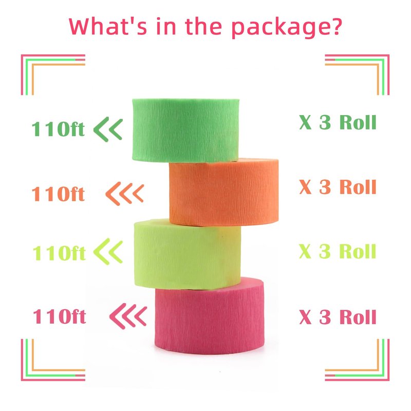 - 【HIGH QUALITY CREPE PAPER 】 Beautiful crepe paper streamers are made of high quality neon paper. You can tie and cut them to size to save more streamers for event and crafts.Crepe paper is gentle to the touch, lightweight and easy to carry around, can be reused, and has a fine texture.