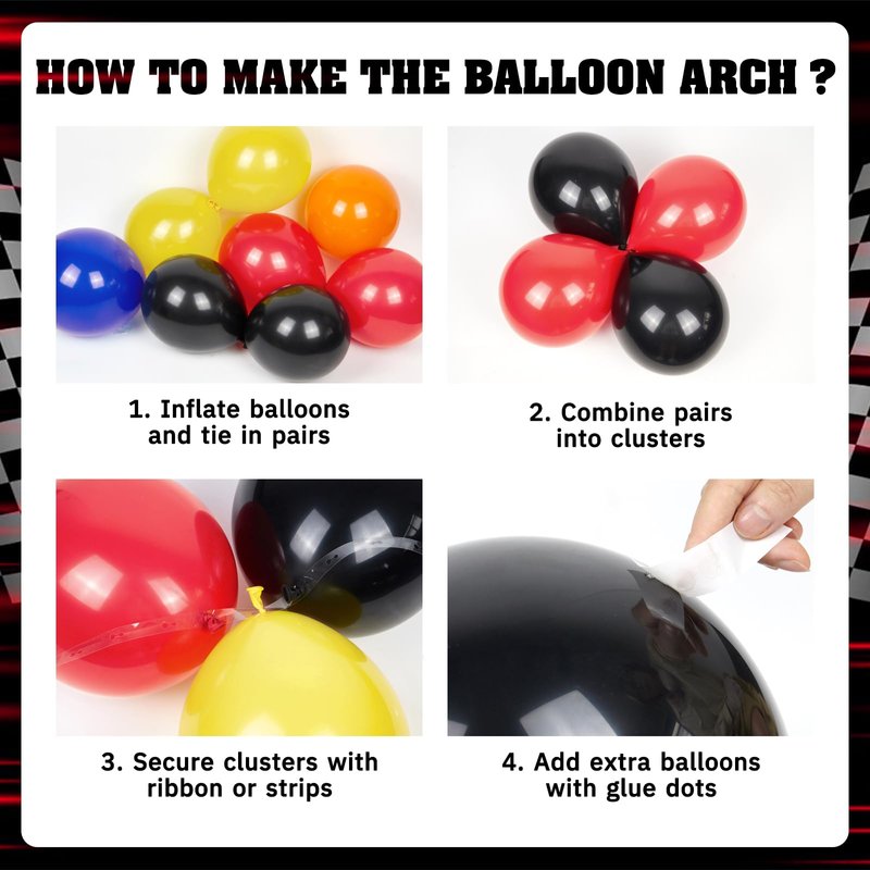 • What You Get: The race car balloon arch kit include 21pcs black balloons(18inchx1, 12inchx10, 5inchx10), 31pcs royal blue balloons(18inchx1, 12inchx10, 5inchx20), 31pcs yellow balloons(18inchx1, 12inchx15, 5inchx15), 20pcs red balloons(10inchx10, 5inchx10), 20pcs orange balloons(10inchx10, 5inchx10), 18inch checkered foil balloonsx5, 26inch wheel tire foil balloonx1, ribbonx1, decorative stripx1, glue dotsx100