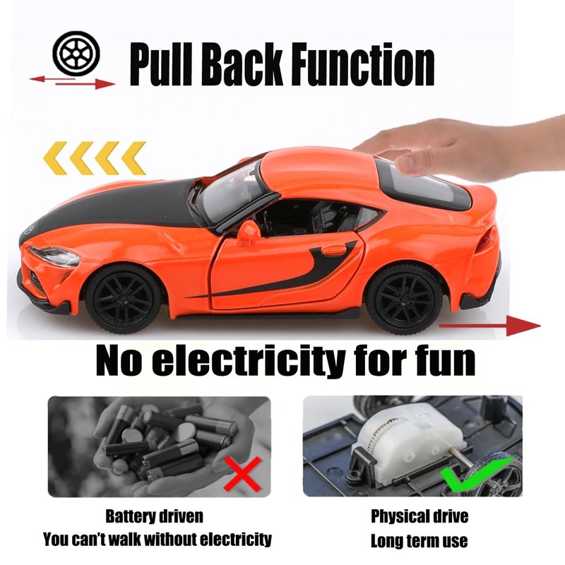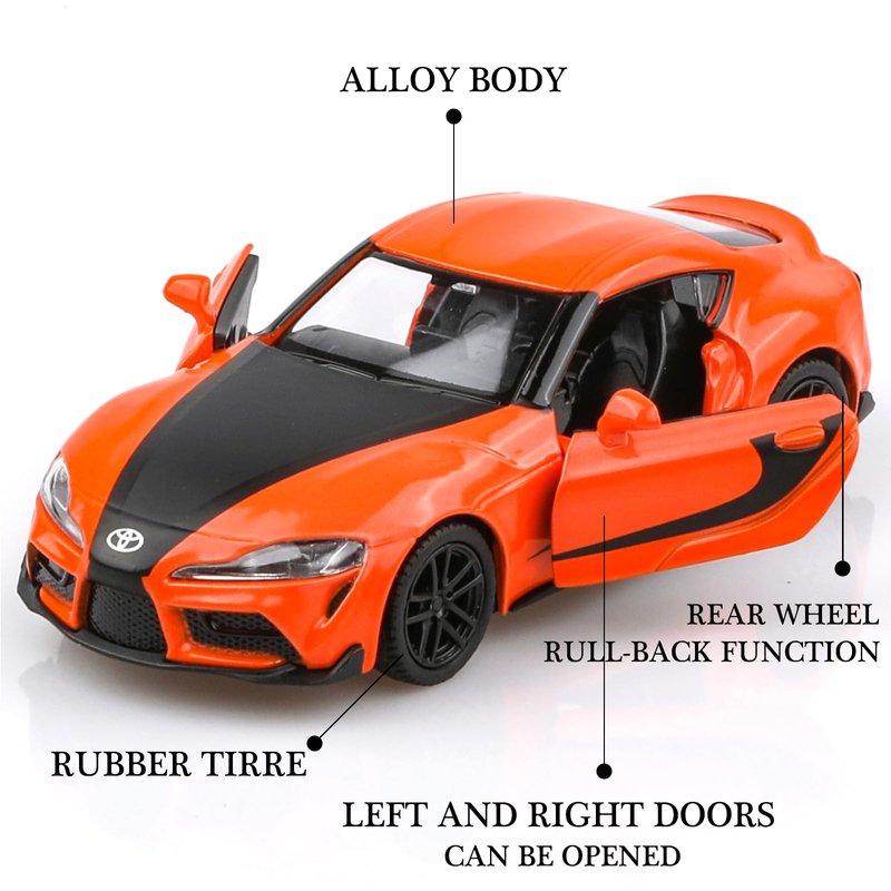 - High-Quality Materials:The TOYOTA Supra die-cast car is made of zinc alloy,plastic parts and rubber tires,making it safe for children to play with.It features detailed interior and exterior trim, and is very sturdy.
