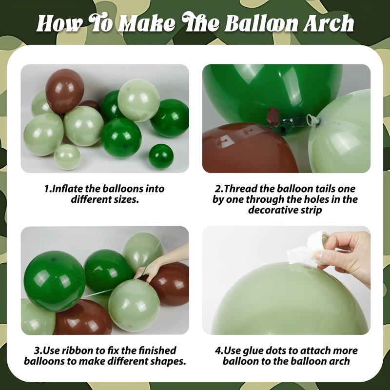 - Easy to Use: We provide 3 tools to help you create camo party decorations more easily and effectively, including ribbons, glue dots, and decorative strip. First, inflate the 18inch 12inch 10inch 5inch balloons with a manual pump. Then, use ribbons to tie the balloons together and hang them on the party backdrop or walls. Finally, use glue dots to stick the 5inch balloons onto the arch to fill in any space