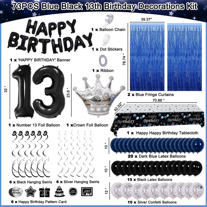 • 73PCS Great Value boys 13th birthday decorations include 1 x black HAPPY BIRTHDAY Balloons banner, 1 x 32" number 13 foil balloon, 2 x blue fringe curtains, 1 x birthday tablecloth, 6 x happy birthday pattern card, 6 x black hanging swirls, 6 x silver hanging swirls, 20 x 10” dark blue balloons, 15 x 10”black balloons, 10 x 12” silver confetti balloons, 1 x 12” crown foil balloon, 1 x balloon chain, 1 x dot stickers, 1 x ribbon.
