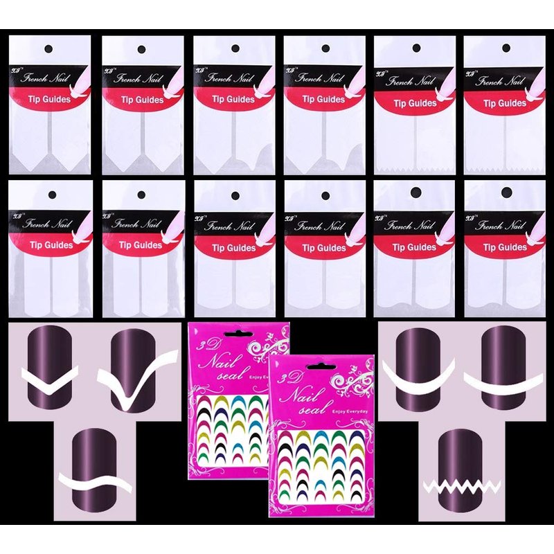 14 pcs Set Nail Tips Guide Various Styles (12 pcs) & Colorful 3D Glitter Nail Decals Stencil (2 pcs)