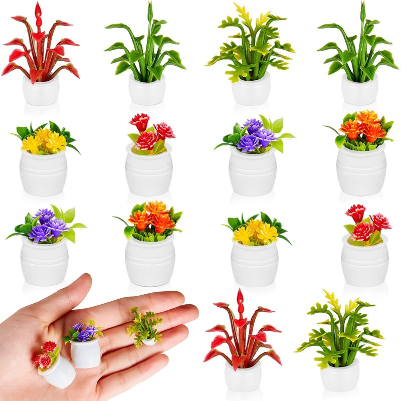 14 Pieces Dollhouse Plant Miniature Bonsai Plant Mini Potted Plant Flower Model Tiny Fake Greenery Ornament Dollhouse Furniture for Christmas Toddlers Girls and Boys (Vivid Style)