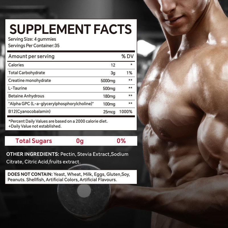 - PREMIUM FORMULA FOR OPTIMAL POTENCE - Our Creatine Monohydrate Gummies feature an advanced formula with 5,000mg of potent Creatine Monohydrate, L-Taurine and Vitamin B12 to maximise muscle strength, muscle growth and recovery, and improve athletic performance. These creatine monohydrate gummies for women and men will fuel your workout like never before!